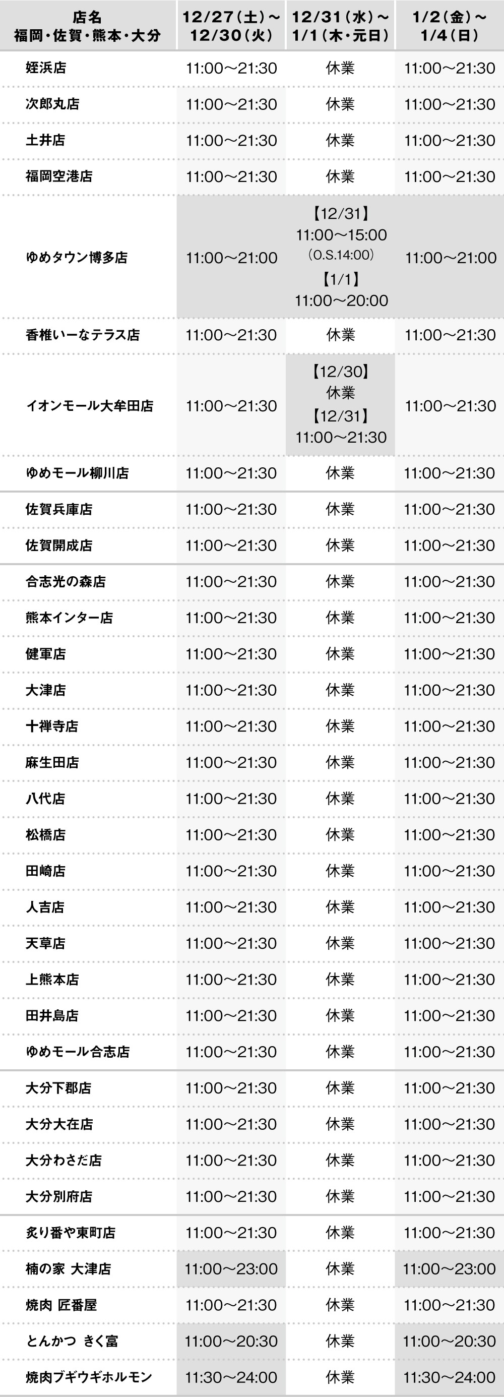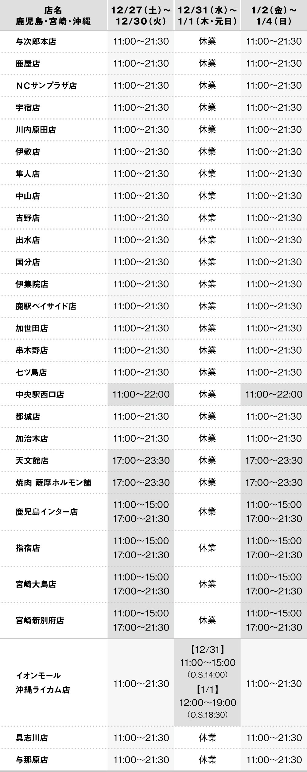 ※焼肉なべしまでは12月27日から12月30日、1月2日から1月4日まで、終日営業しております(一部店舗は除く)。詳細は各店舗へお問い合わせください。