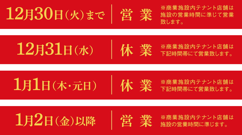 ※ただし、商業施設内テナント店舗は一部を除き12月31日(水)も営業致します。
